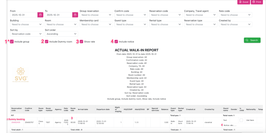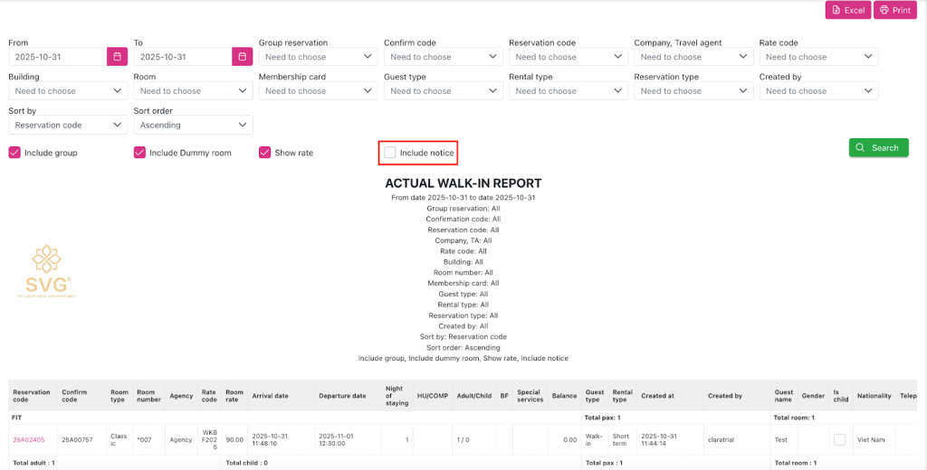 - “Include Group” = OFF (or when there is no group booking walk in in the date range)