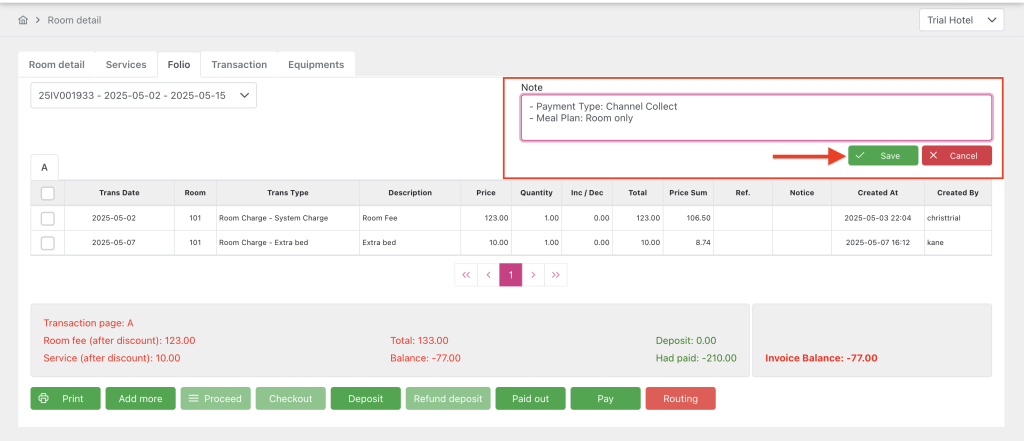3. Add/ Edit Note Folio tab in Cashier Menu > Transaction screen