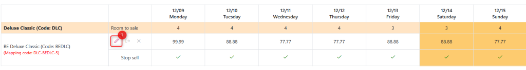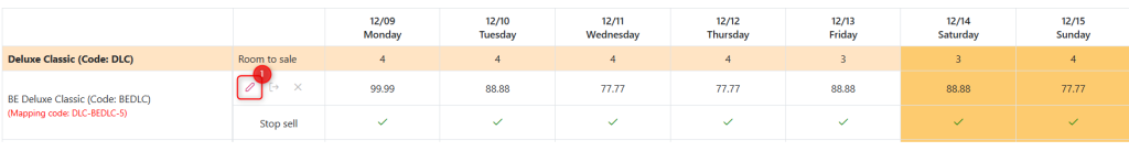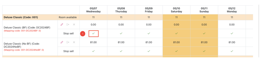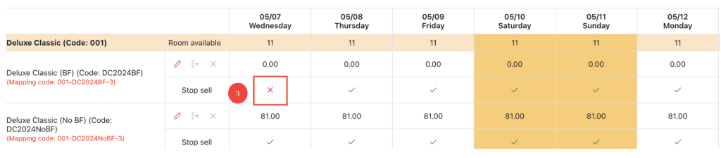Step 2: Select a specific date that hotel does not want to sell on BE channel by clicking check icon (2)