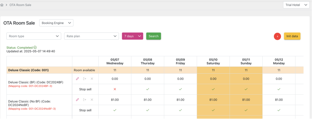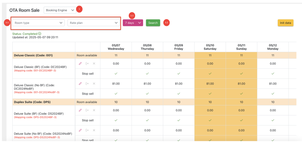 - Filter Room type/ Rate plan (1.1) > Search (1.2)