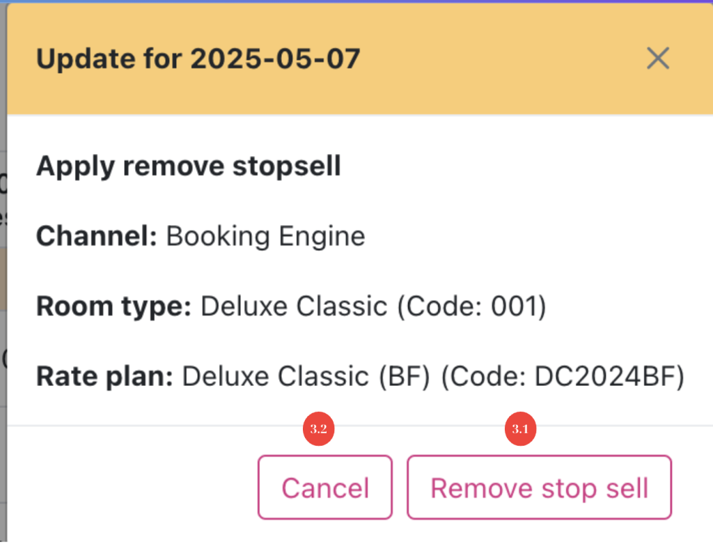 Step 3: After selecting Stop sell (2.1) button > check icon will change “x” (3) > Click