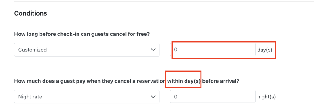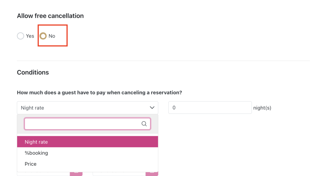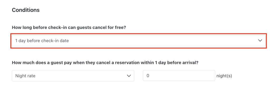 - Select item “Before check in date” → Display droplist with label “How much will the customer have to pay if the guest cancels the reservation on the day of arrival?” (1)