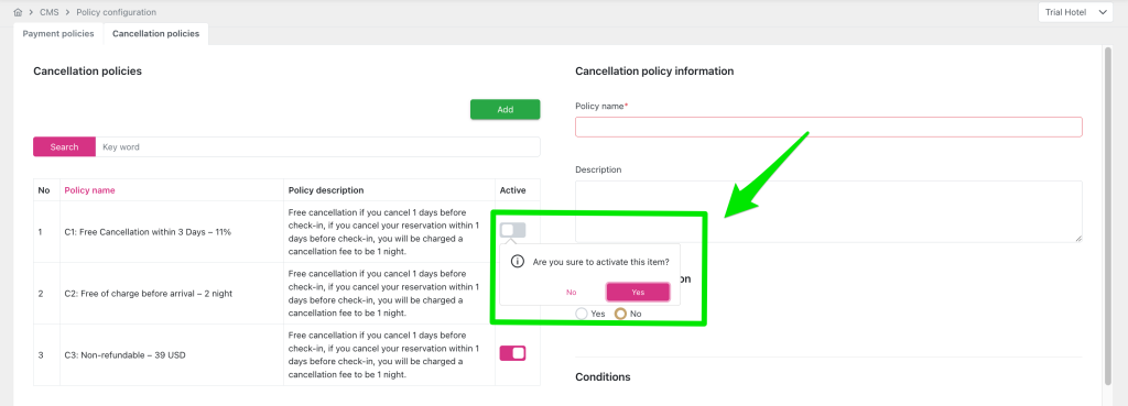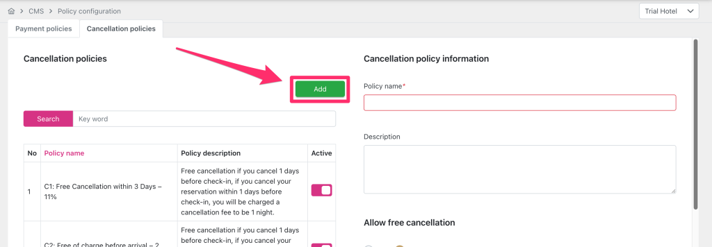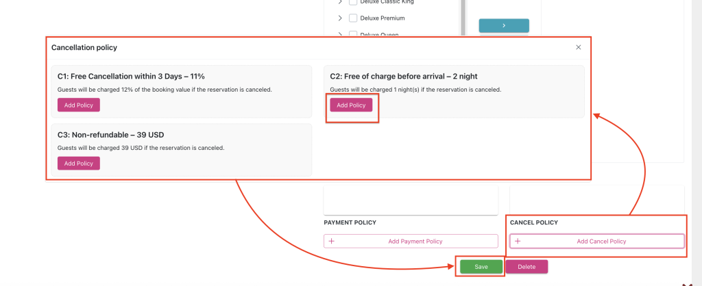 Step 2: Click the Add cancel policy button to show pop up of active cancellation policies list > Click Add Policy to choose > Save