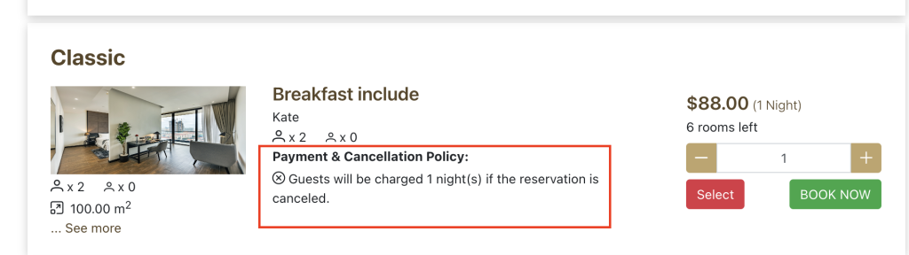 If the user selects R2 → The “Select” and “Book now” buttons of R1 and R3 are disabled. In the “Hotel’s policy” section on the “Booking confirmation” email form, the Cancellation policy and Payment policy of Rate plan R2 will be displayed.