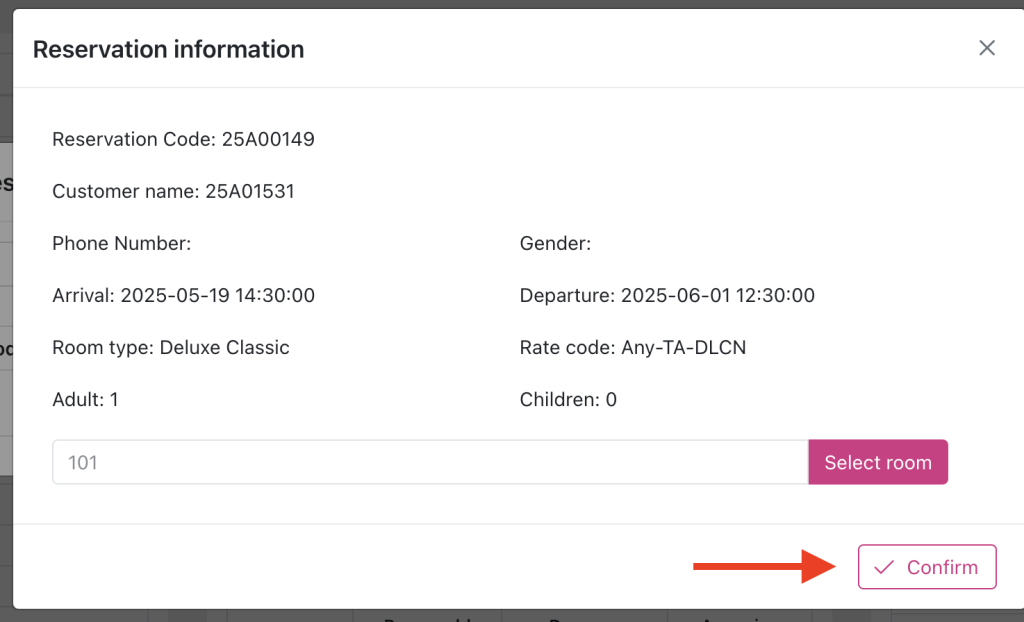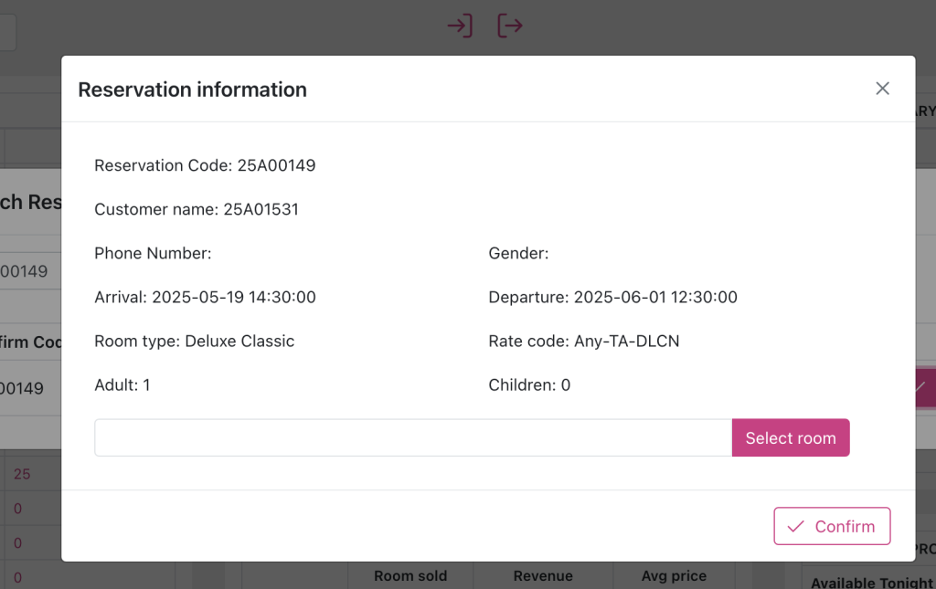 Step 3: If booking has not been assigned room number yet, click the Select room button to show List room pop up.