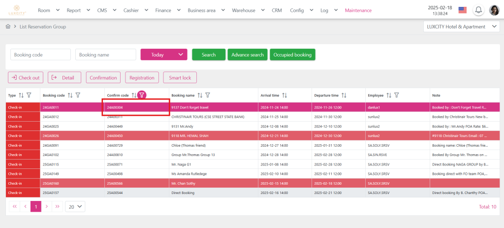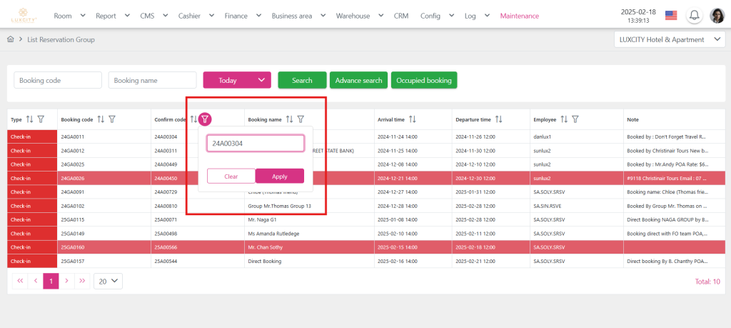 Step 2: Filter the child bookings within the group booking using the Confirm code (2), for example, “24A01847”. Click the Apply button (3) to display the filtered results (4).