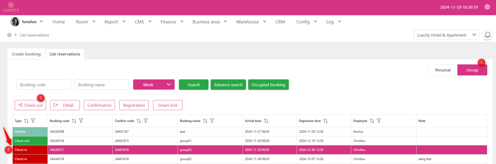 Step 2: Find and select the group booking you want to check in (2), then click the Check out button (3).