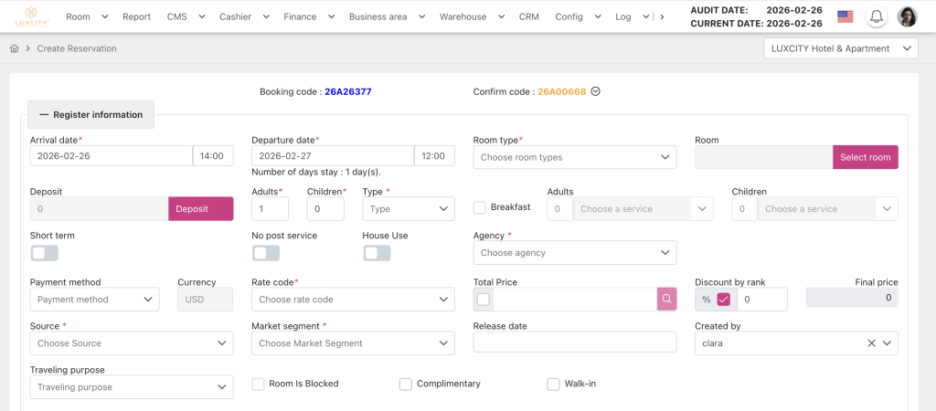 - Source: Select the source of the booking (e.g., direct, online agency, etc.).