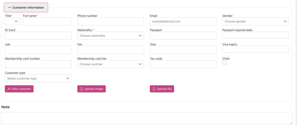 - Payment Method: Choose the method of payment (credit card, cash, etc.), only require when having deposit or special services.