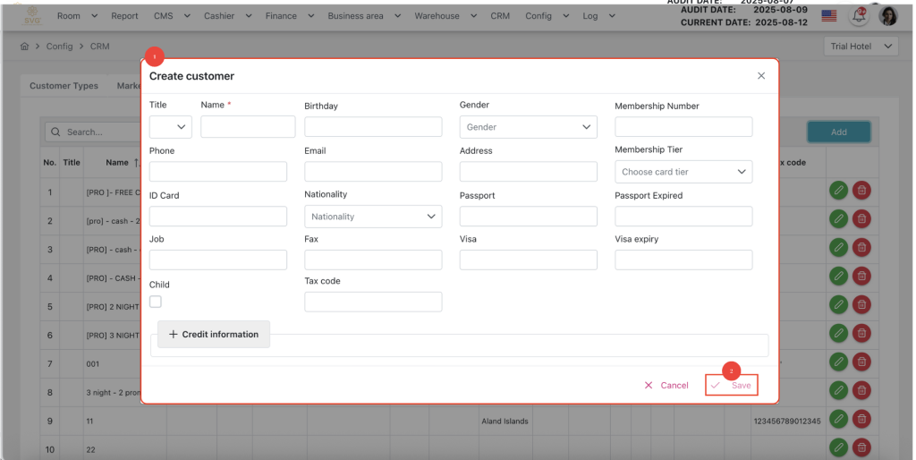 - Step 2: Enter the required information (marked as *) on the Create customer popup (2).