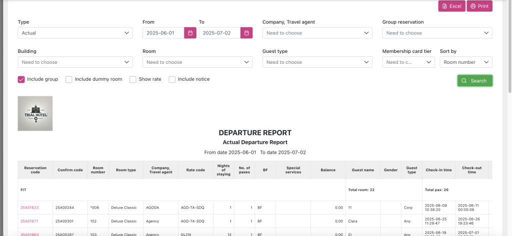 The Departure Report is developed to assist front desk staff in easily tracking and summarizing the number of guests checking out on the selected day, facilitating preparations for payment and guest farewells.