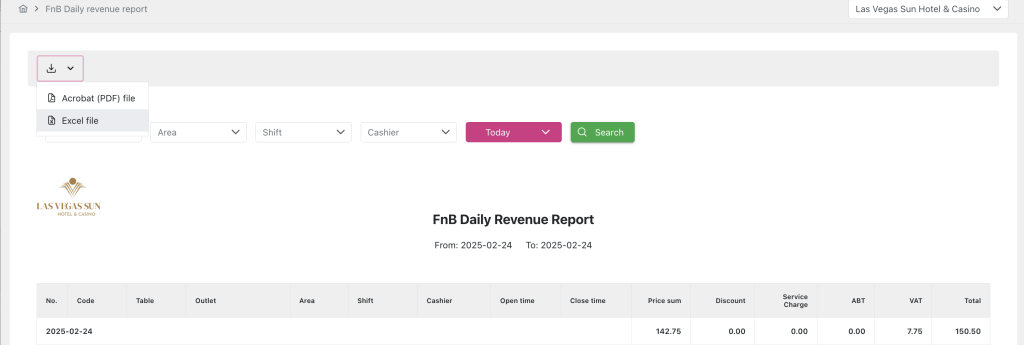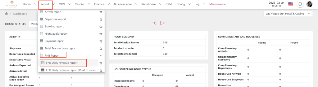 Navigation: Click on the Report menu in the top navigation bar > Select “FnB report” group and scroll down to select the FnB Daily revenue report