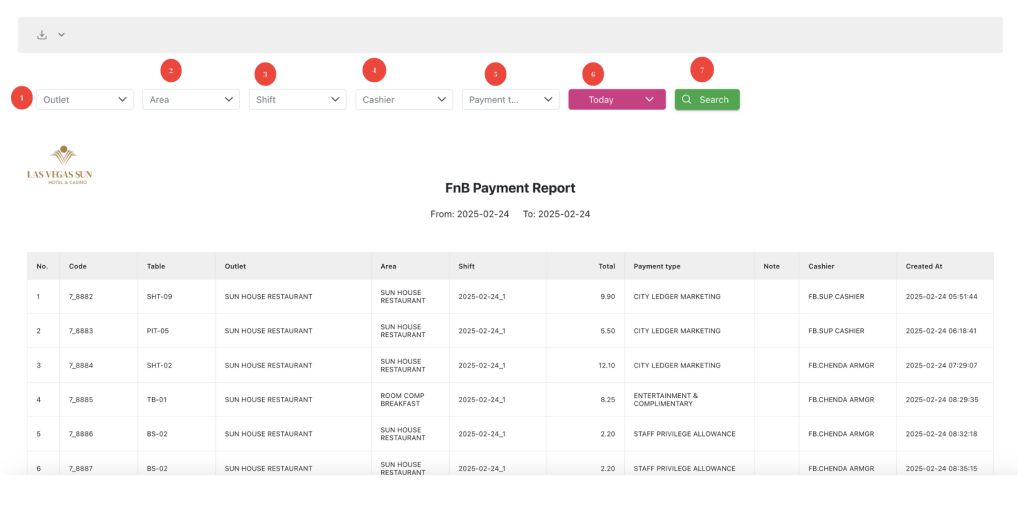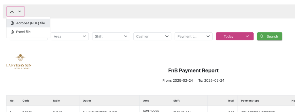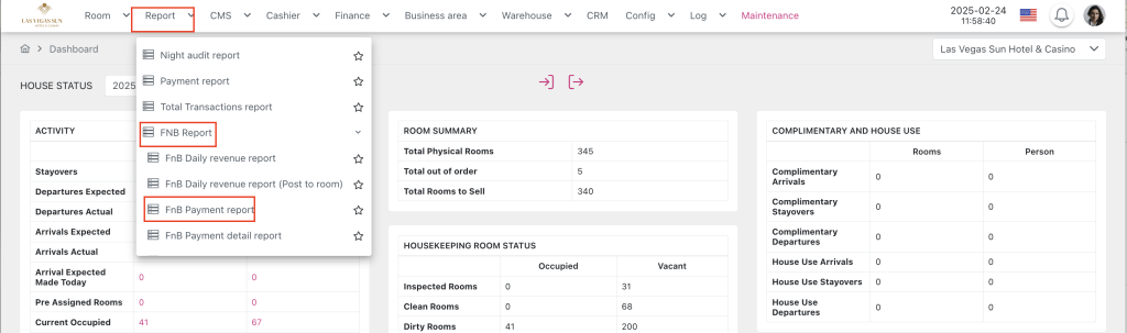 Navigation: Click on the Report menu in the top navigation bar > Select “FnB report” group and scroll down to select the FnB Payment report