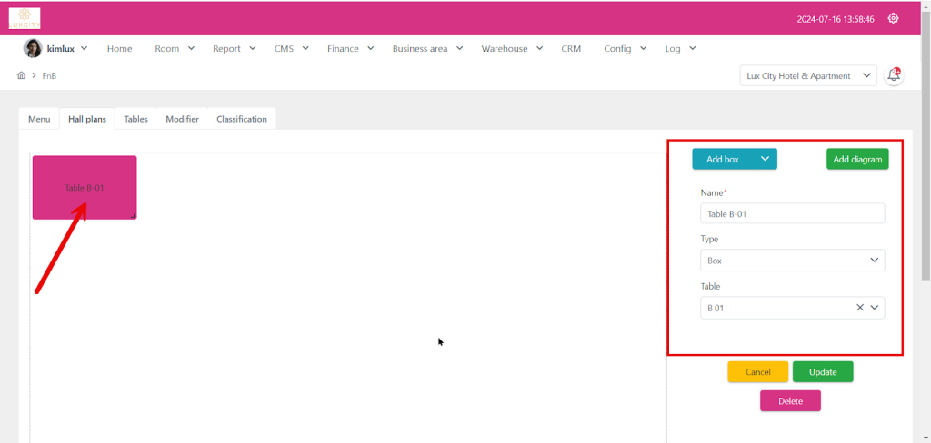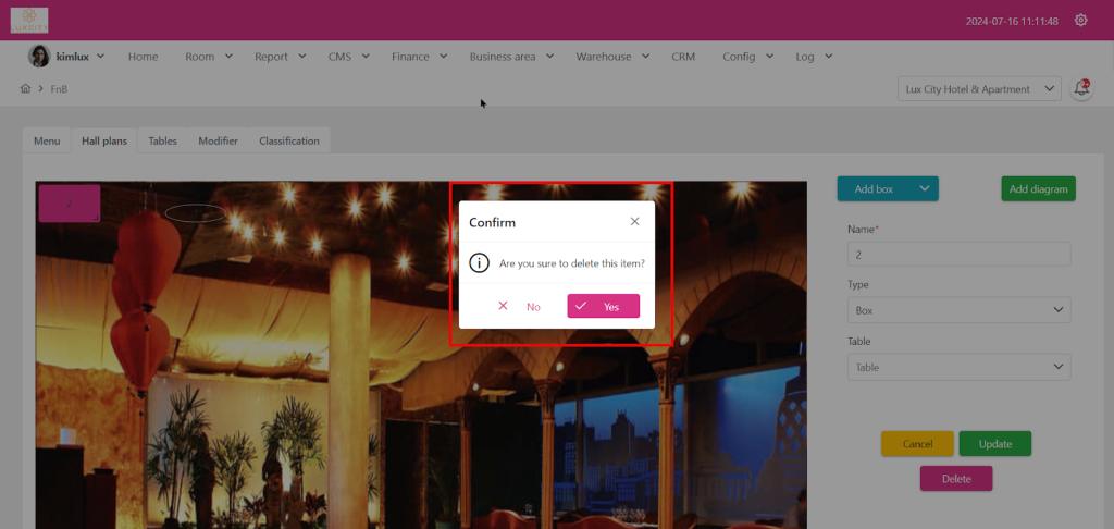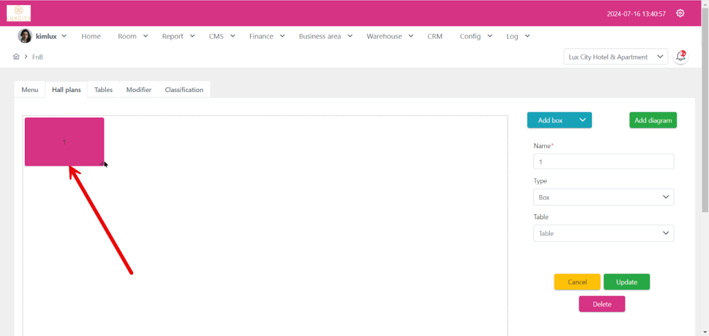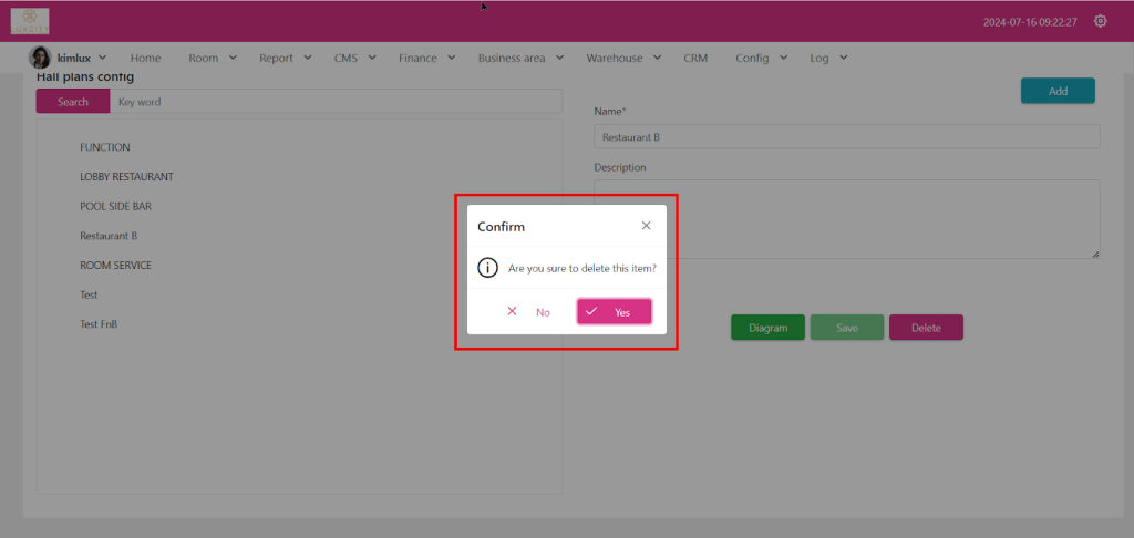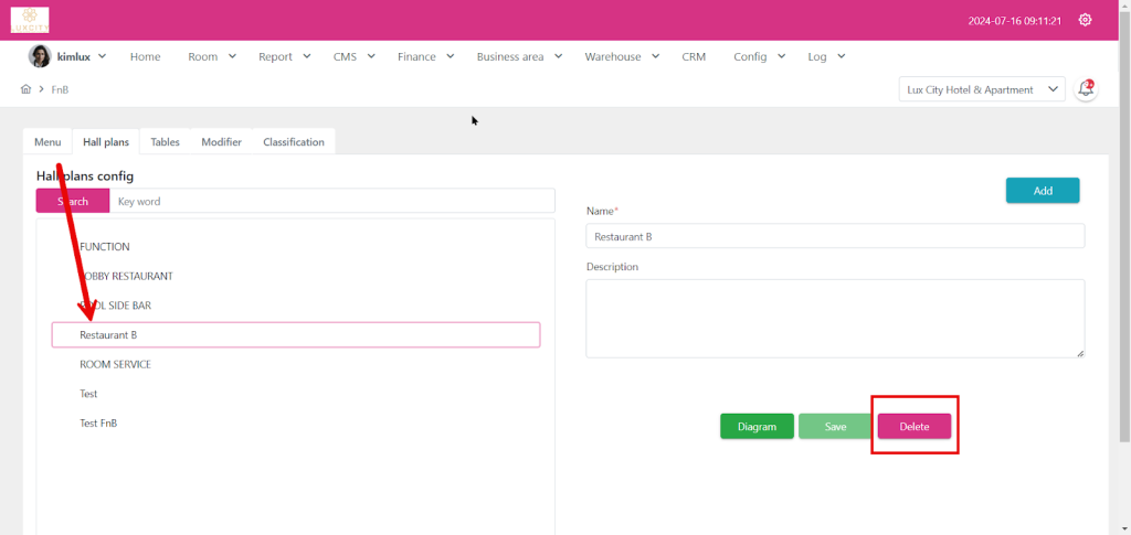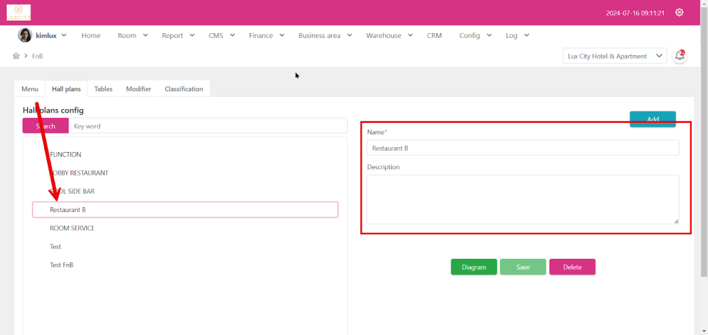 - Go to Config proceed to business area choose “FnB” => Hall plans