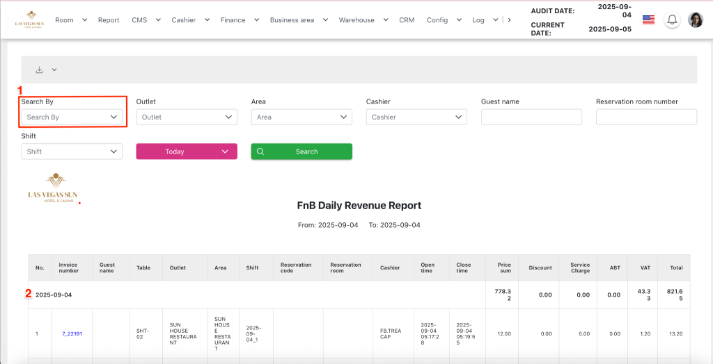 Navigation: Report > Business area report > FnB > FnB Daily Revenue Report