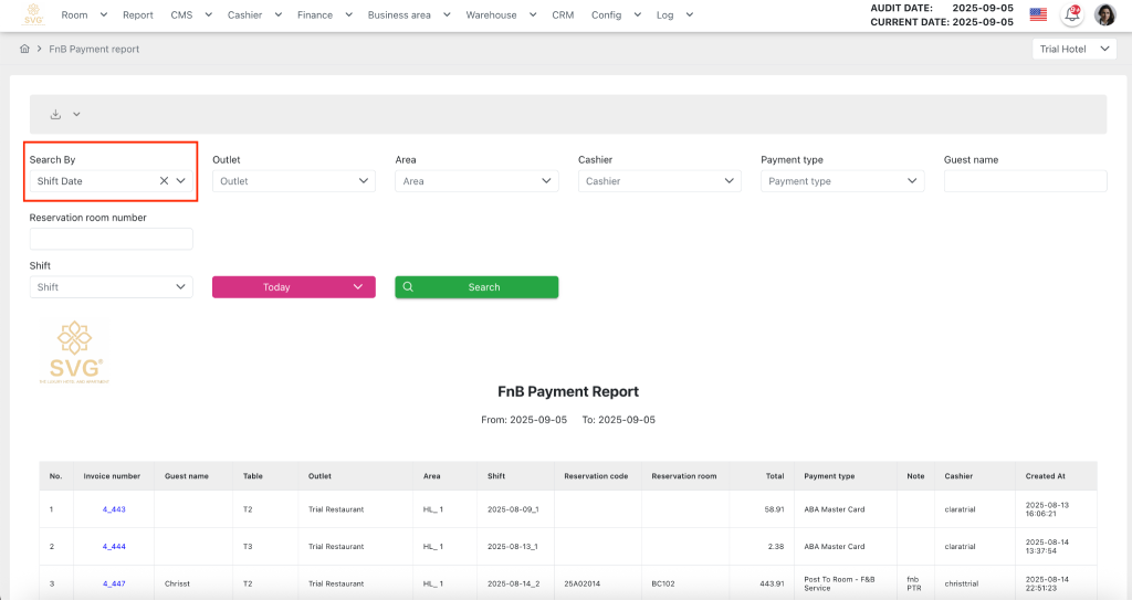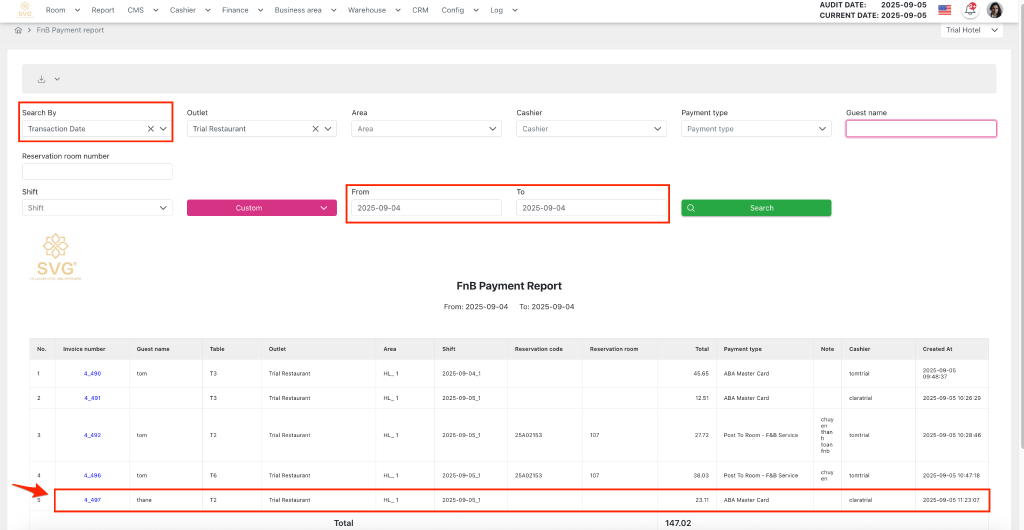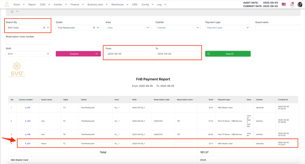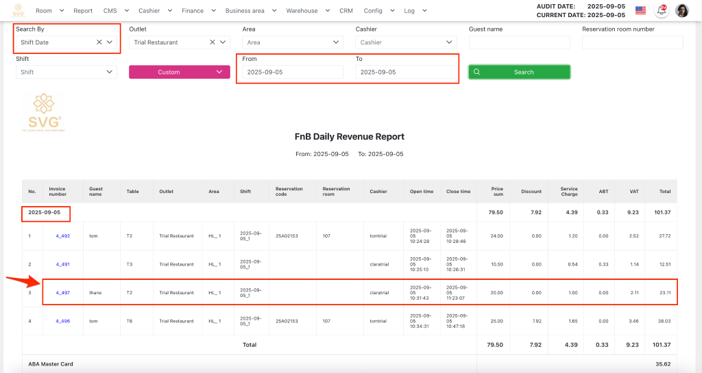 Select Search by = Shift date and custom the time period from 2025-09-05 to 2025-09-05 and press Search →  the transaction of bill will be displayed in table and The Date “YYYY-MM-DD” is 2025-09-05