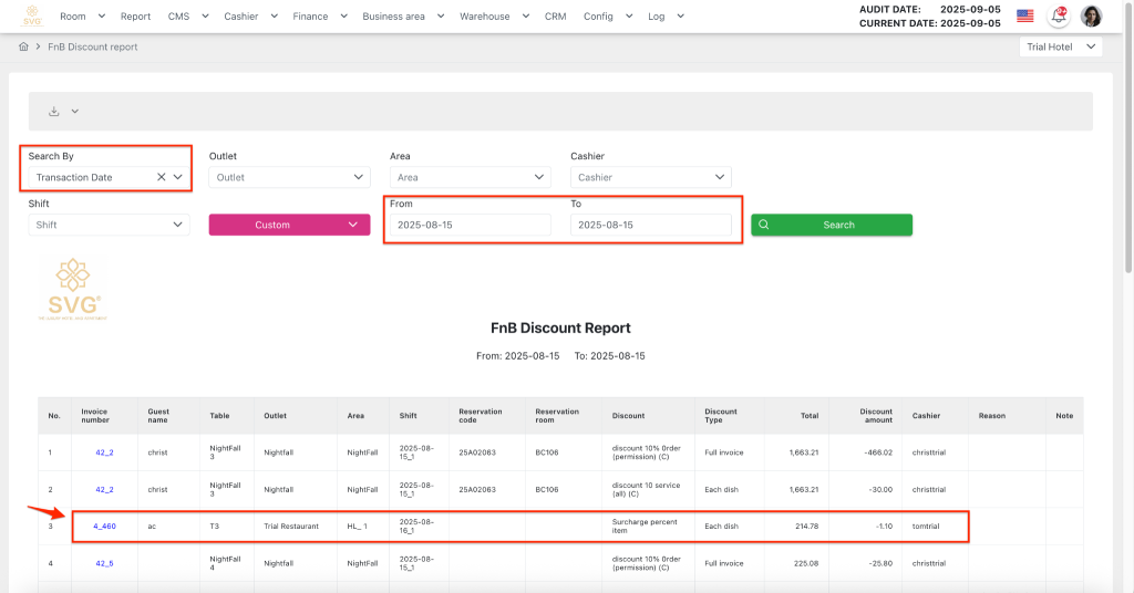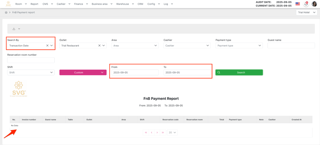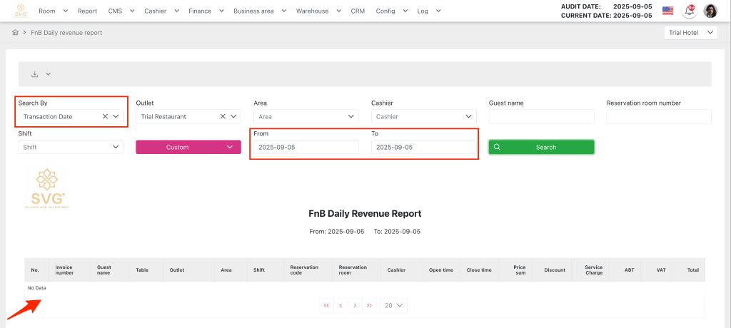 OnSelect Search by = Transaction date:when user press Search button, the below table will display all data belong to night audit date