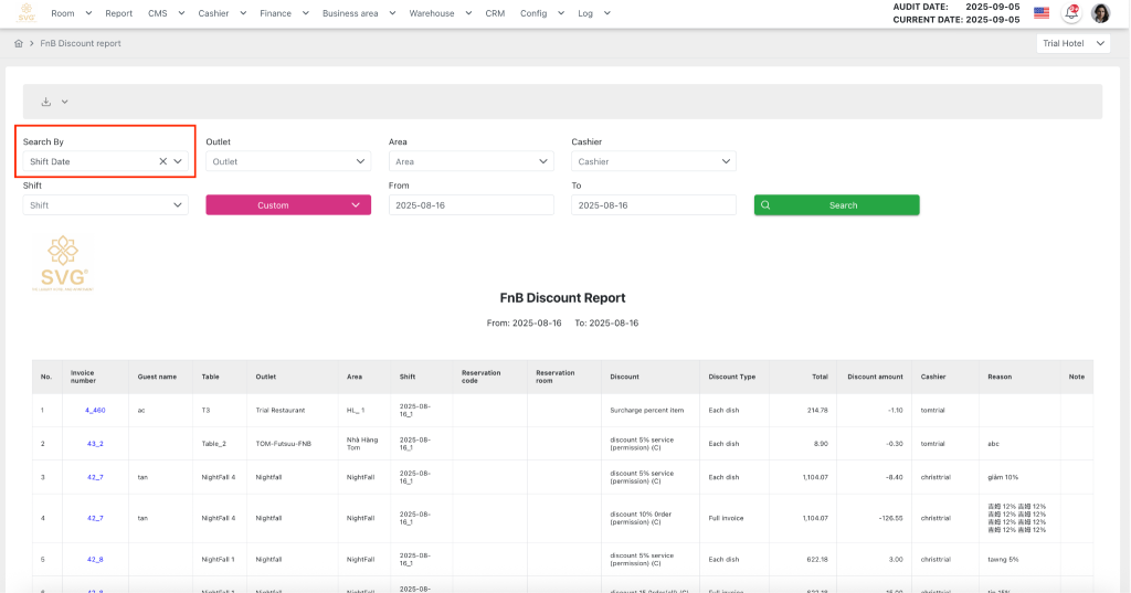 Navigation: Report > Business area report > FnB > FnB Discount Report