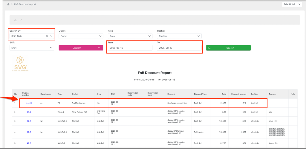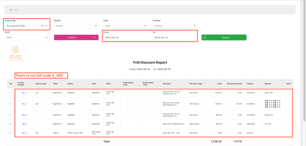 Select Search by = Shift date and custom the time period from 2025-08-16 to 2025-08-16 and press Search →  the transaction of bill will be displayed in table