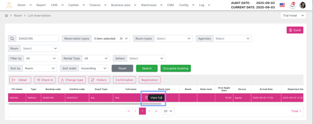 At list reservation of personal booking, hover the “zoom out” icon will show tooltip “View full” and click show all guest names. Display all guest names of booking in Full name column by order:
