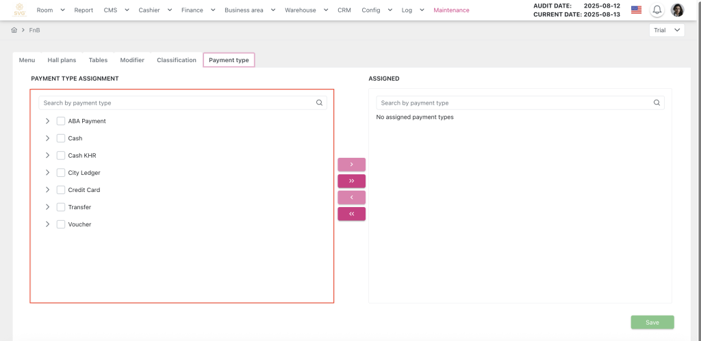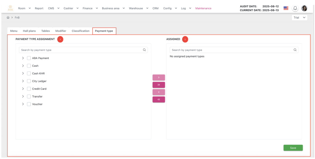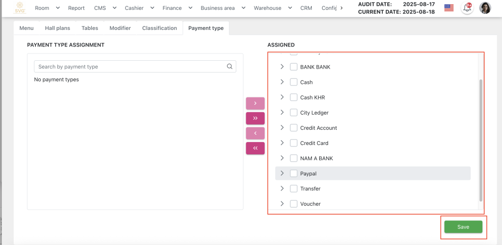 “<” button: After the user checks the payment types they want to unassign in the Assigned table and clicks this button → the Assigned table will display the payment type groups and the payment type the user has just selected to assign. The payment types that have been transferred to the Unassigned table will not be displayed in the Assigned table anymore.