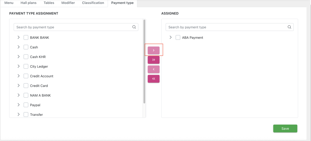 “>>” button: If the user wants to assign all payment types, click this button, regardless of whether the payment type is checked in the checkbox or not.