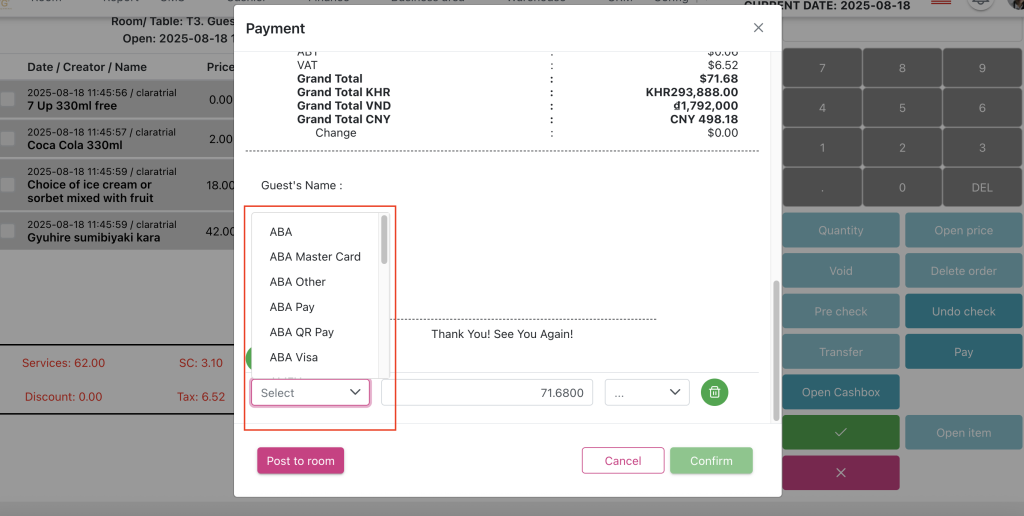 When user click pay, the final bill popup, the droplist “payment type” will show all items that configured at Config > Business area > Business area item > tab Payment type.