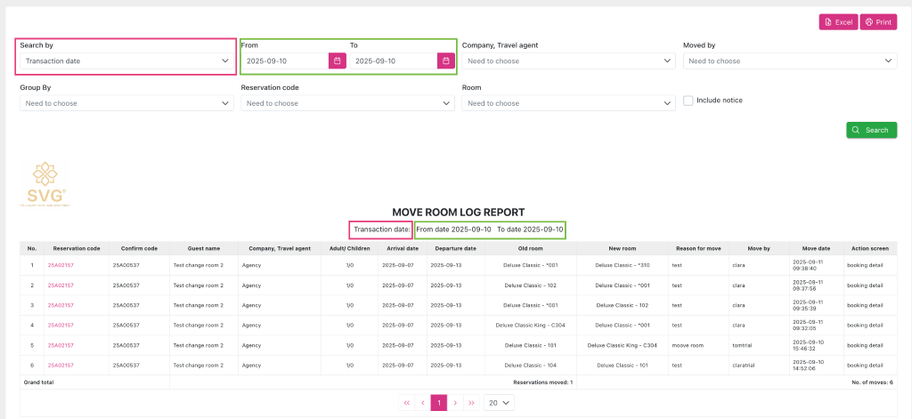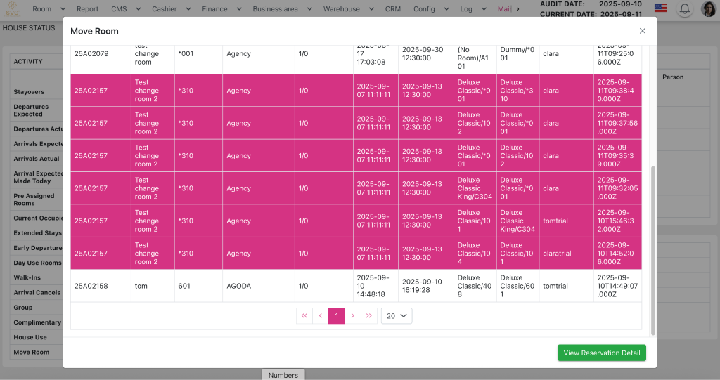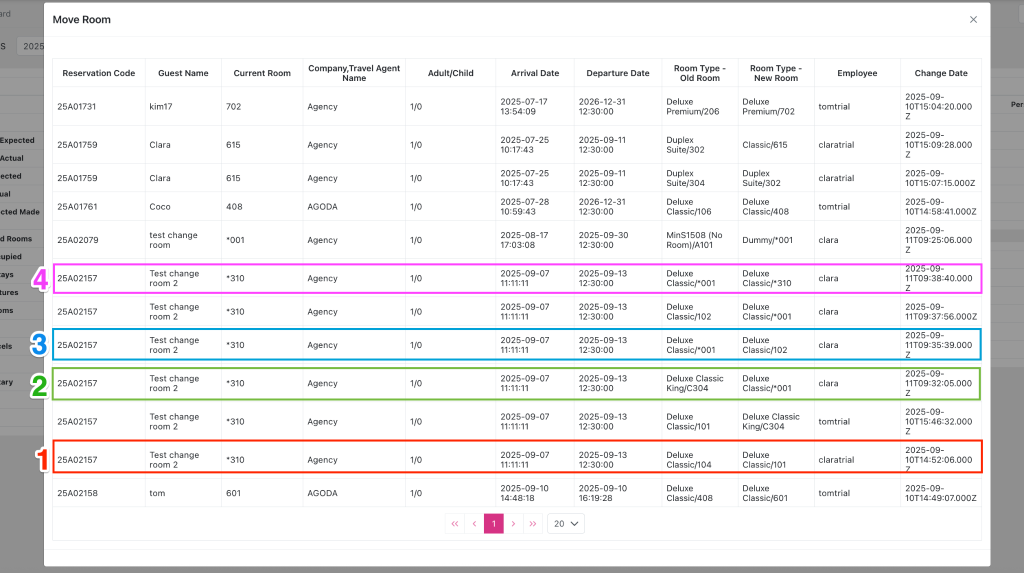 If a booking changed a lot of rooms in the same audit date → all move room logs of this booking in pop up will be colored pink to check easily: