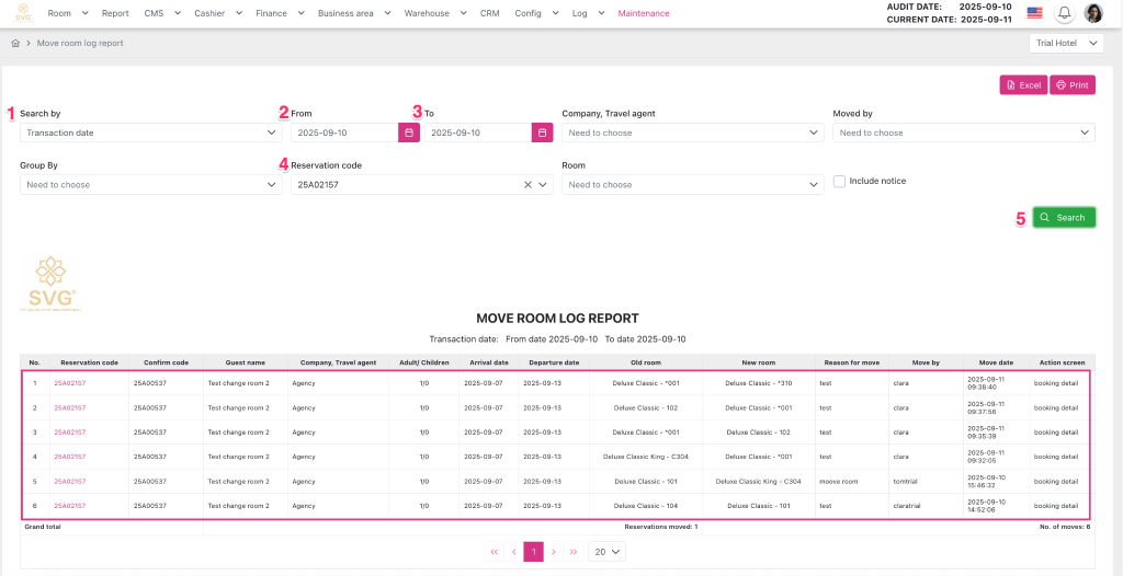 Results: Report will display all move room logs of this booking and the same as Dashboard screen’s