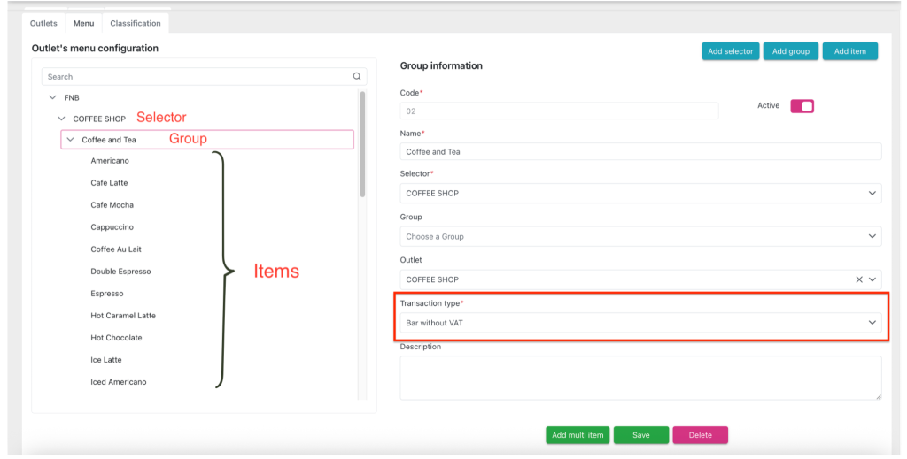2. In the Config screen > Business area > Outlets > Menu tab, add the “Transaction type” field when the user adds/edits a Selector group.