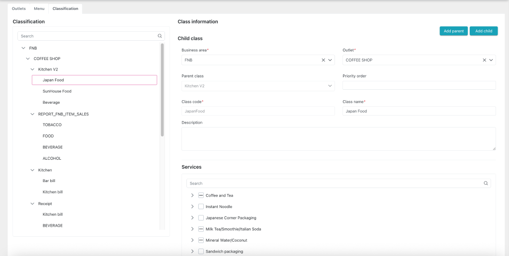 Move the Classification tab screen from Config > Business area > FnB / KTV to Config > Outlets, located to the right of the Menu tab.