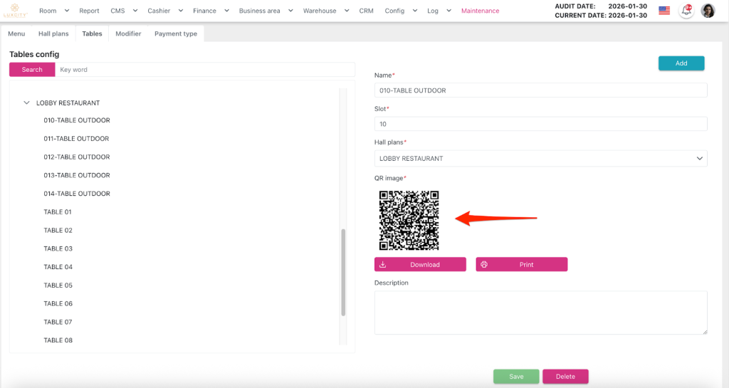 QR code scanning feature: This feature allows customers to scan a QR code placed on the table to access the store’s E-Menu and it is located at Config > Business Area > FnB > Tables