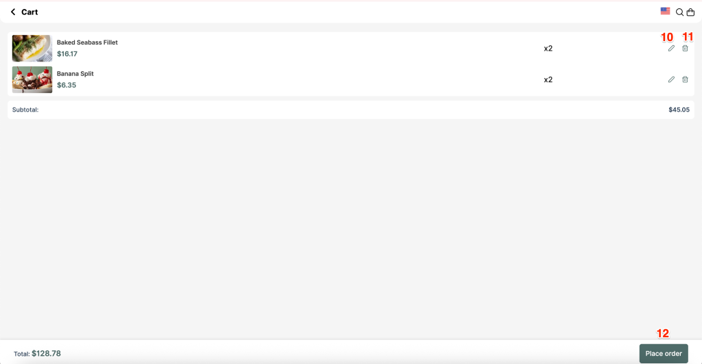 - After choosing items and quantities of items, click Checkout including subtotal price on button (9) (Formula = Number of items * Price including VAT of the dish)