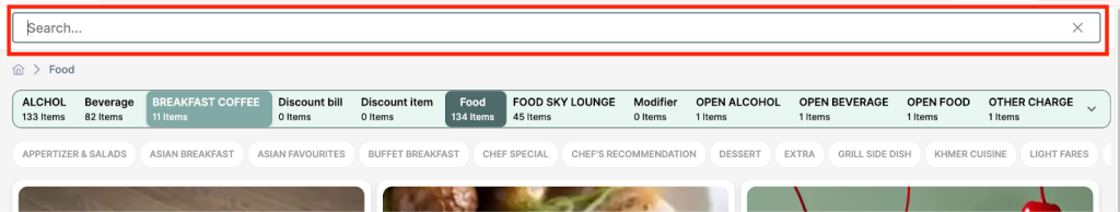 - Click magnifying icon (2) allows users to search by food category name or food name.