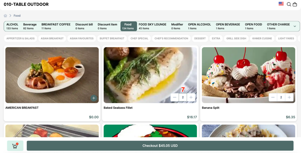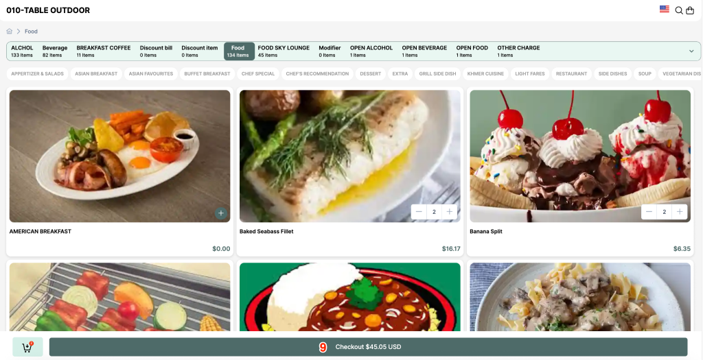 Step1: View the electronic menu categorized by type (drinks, food, desserts, etc.)