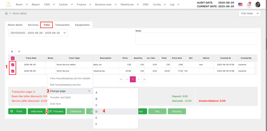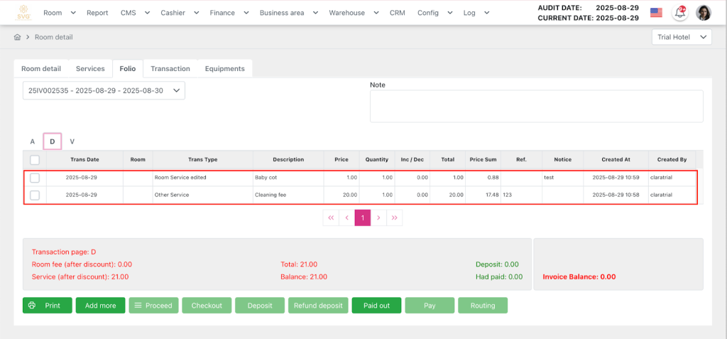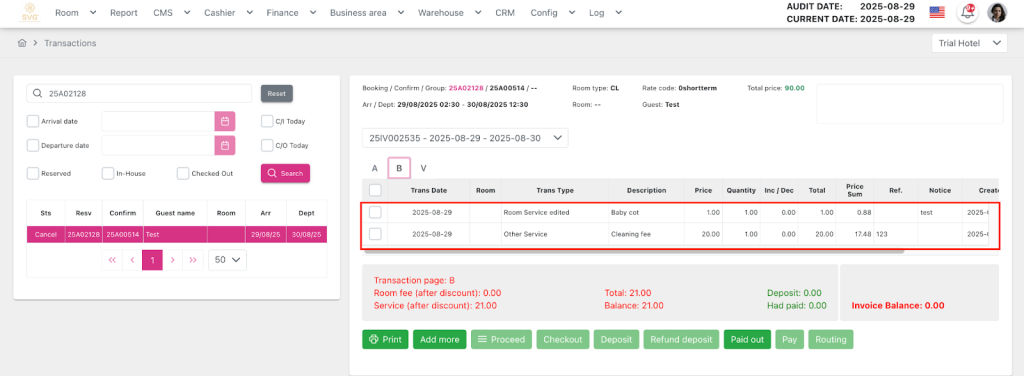 - Update allow transferring one or multi transaction lines from this page to the other page ( except page V) in Folio tab > Detail Booking or Cashier > Transaction at The Same booking ( unapplied for different bookings ) and Booking’s Reservation type is Checkout/ Cancelled/ No-show
