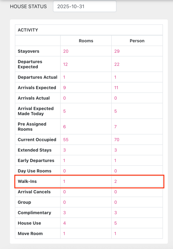 - “Rooms” column: Counts bookings with booking.is_walkin = 1 and booking.checkin date = audit_date