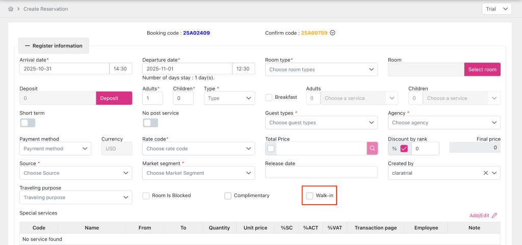- Allows applying Rate plan, Agency, Market segment, Source for walk-in customers.