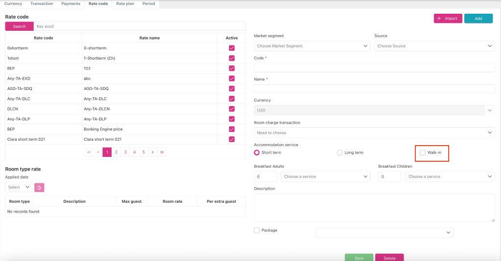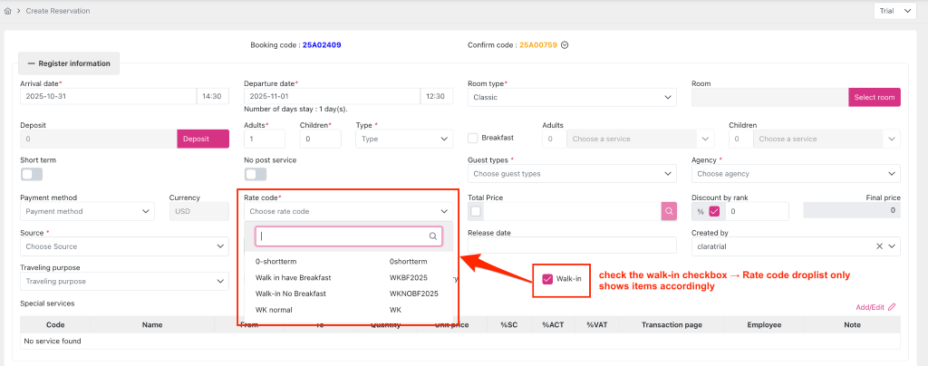 - State checkbox “Walk-in” = unchecked, field “Rate code” only displays rate code options with price.is_walkin = 0.