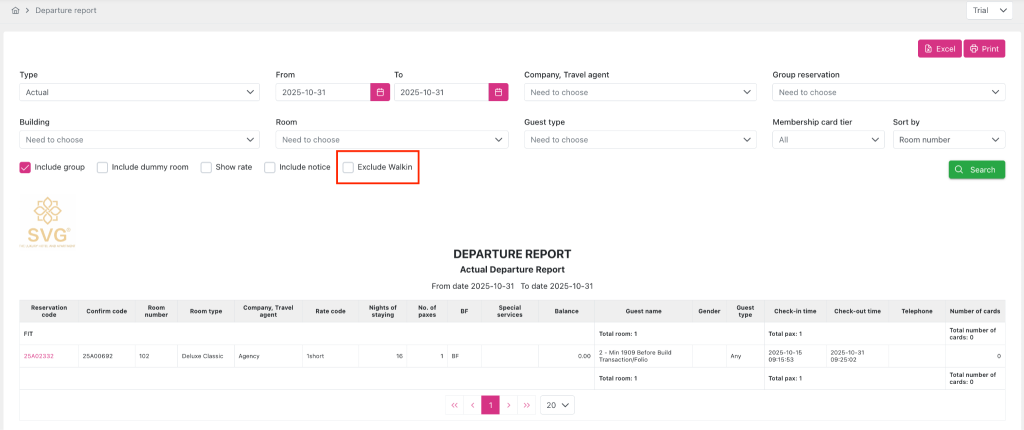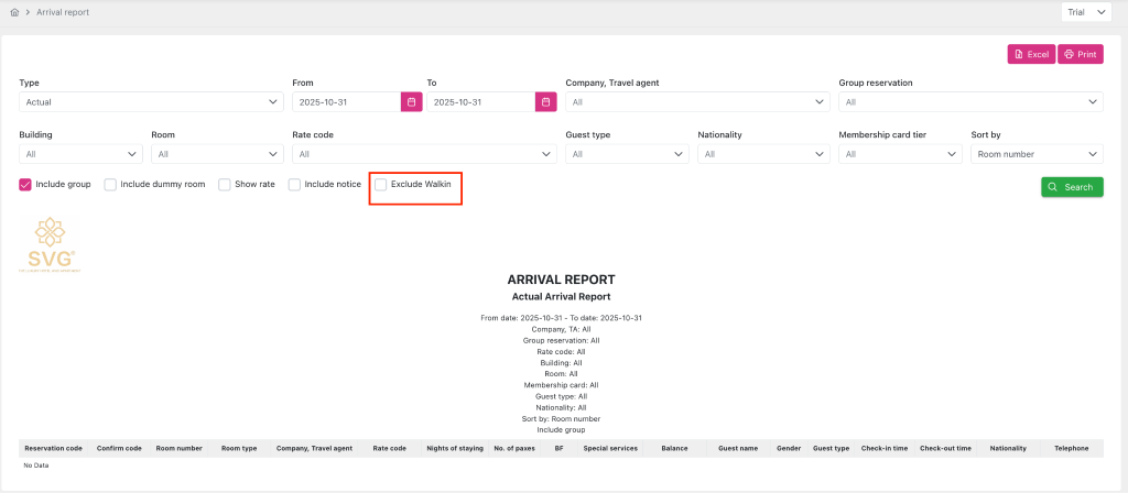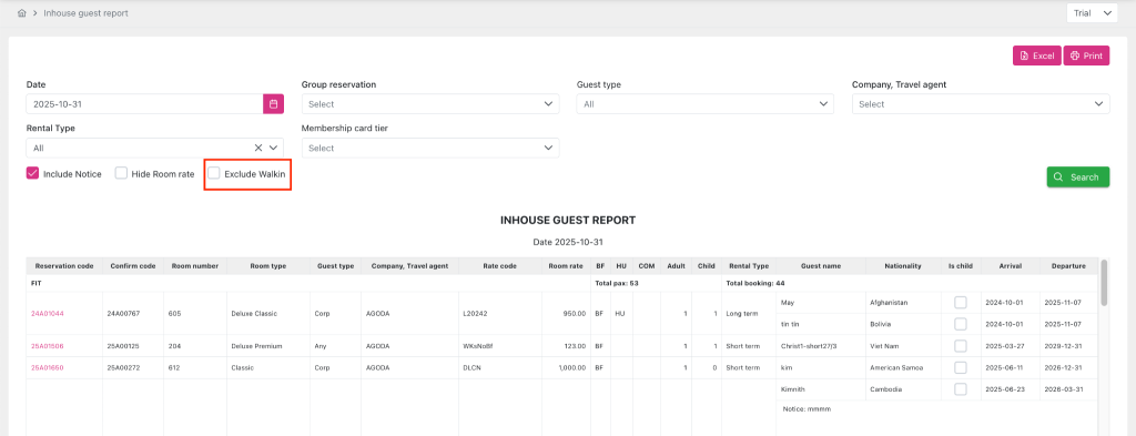 - Add “Exclude Walkin” checkbox on “Arrvial report”/ “Departure report”/ “Inhouse guest report”/ “Booking report” report screens. By default, the “Exclude Walkin” checkbox is not selected when a new user accesses the report screen for the first time. If:
