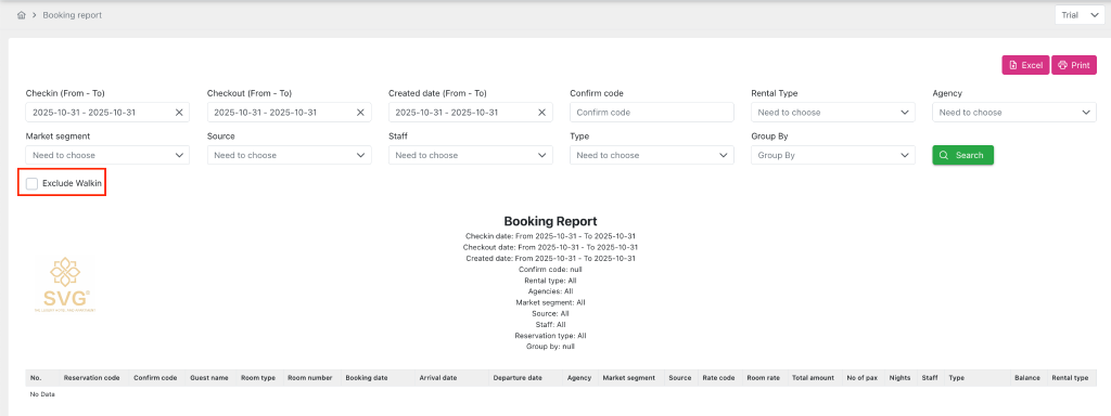 - State checkbox “Exclude Walkin” = 1 → displays data of bookings with booking.is_walkin = 1 and whose values match the criteria the user is filtering.
