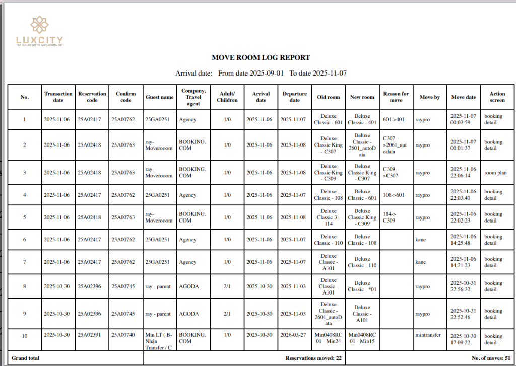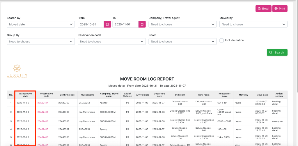 - HM-5851 : [PRO] - Add column Transaction date in Report Move room log report