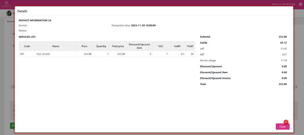 Step 2: The Details popup will appear, allowing you to view the housekeeping service information. To close the popup, click the Close button (4).