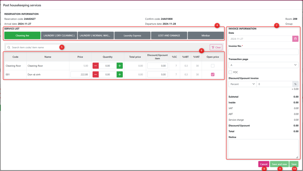 Step 3: On the Post housekeeping services popup, choose the service type (4), such as Cleaning fee, Laundry Express, Minibar…
