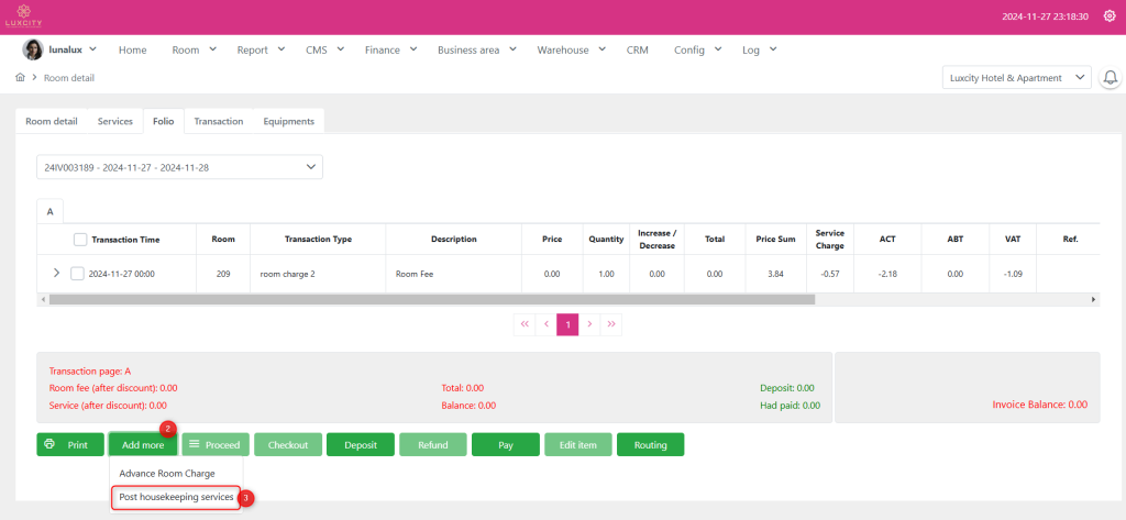 Step 2: Go to the Folio tab. Click the Add more button (2), select Post housekeeping services (3), and the Post housekeeping services popup will appear.