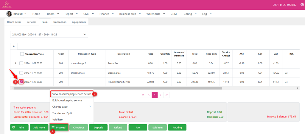 Step 1: Under the Folio tab, check the checkbox for the housekeeping service (1), then click the Proceed button (2) and select View housekeeping service details (3).