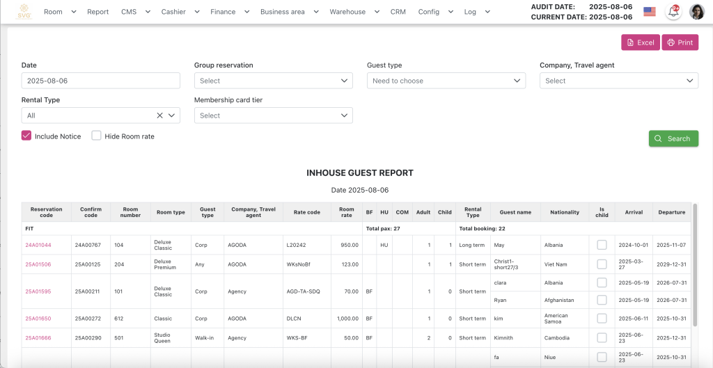 The In-house Guest Report provides a summary of bookings currently checked in (except dummy booking) at the hotel on the specified search date.