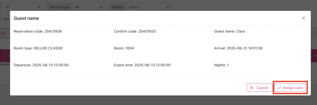 - Put the key card on the Card Reader machine, then click Assign card button => Display Booking list.