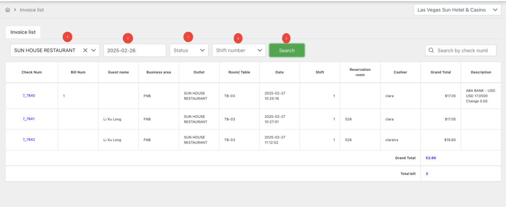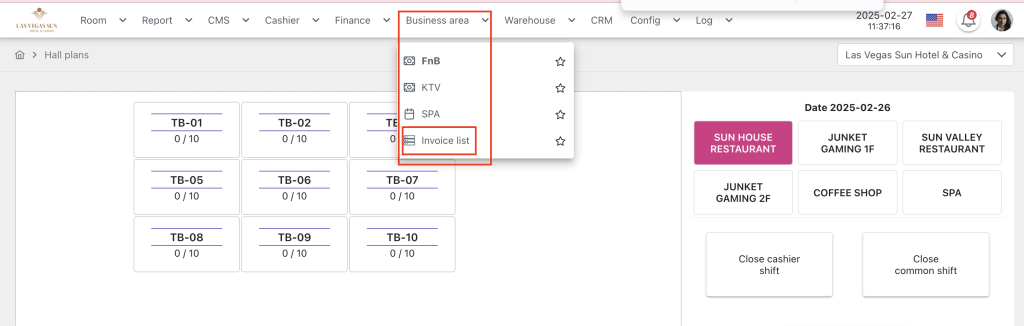 Navigation: FnB menu > Invoice list, only displayed for users are added this function in config.
