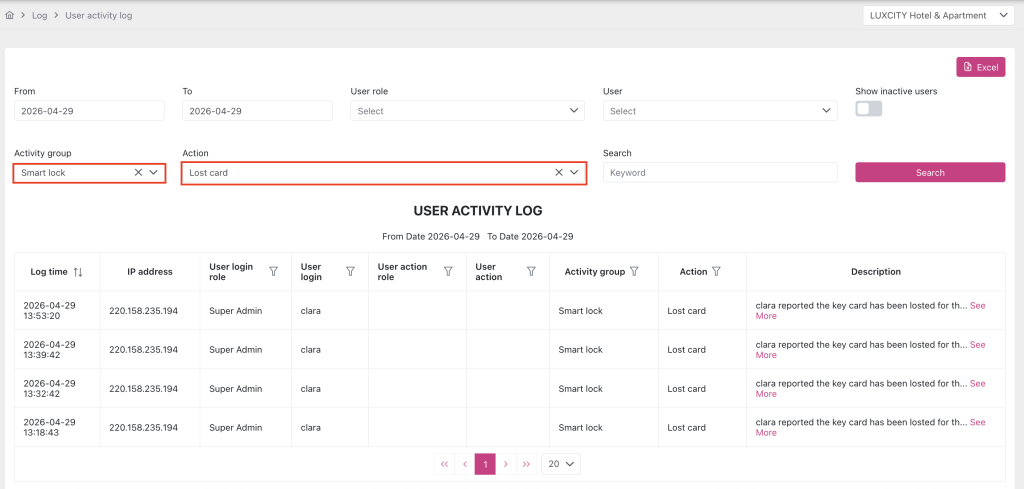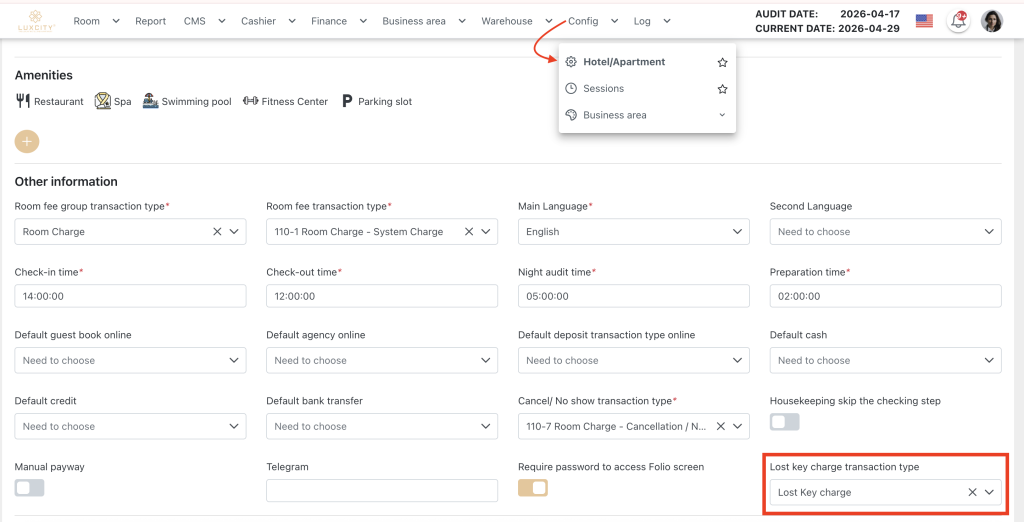 1. Add “Lost key charge transaction type” > other information > Hotel/ Apartment config > Config